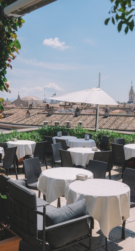 Il nostro rooftop affacciato sulla storia senza tempo della Città Eterna offre lo scenario ideale per un aperitivo rilassante cullati dalla luce magica del cielo in ogni momento del giorno ma soprattutto al tramonto assaporando i cocktail classici e innovativi dei nostri bartender accompagnati dagli stuzzichini gourmet preparati ogni giorno dalla nostra cucina.